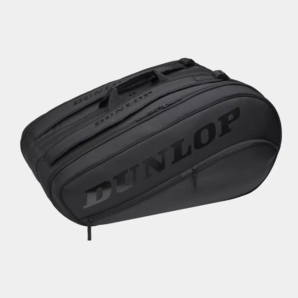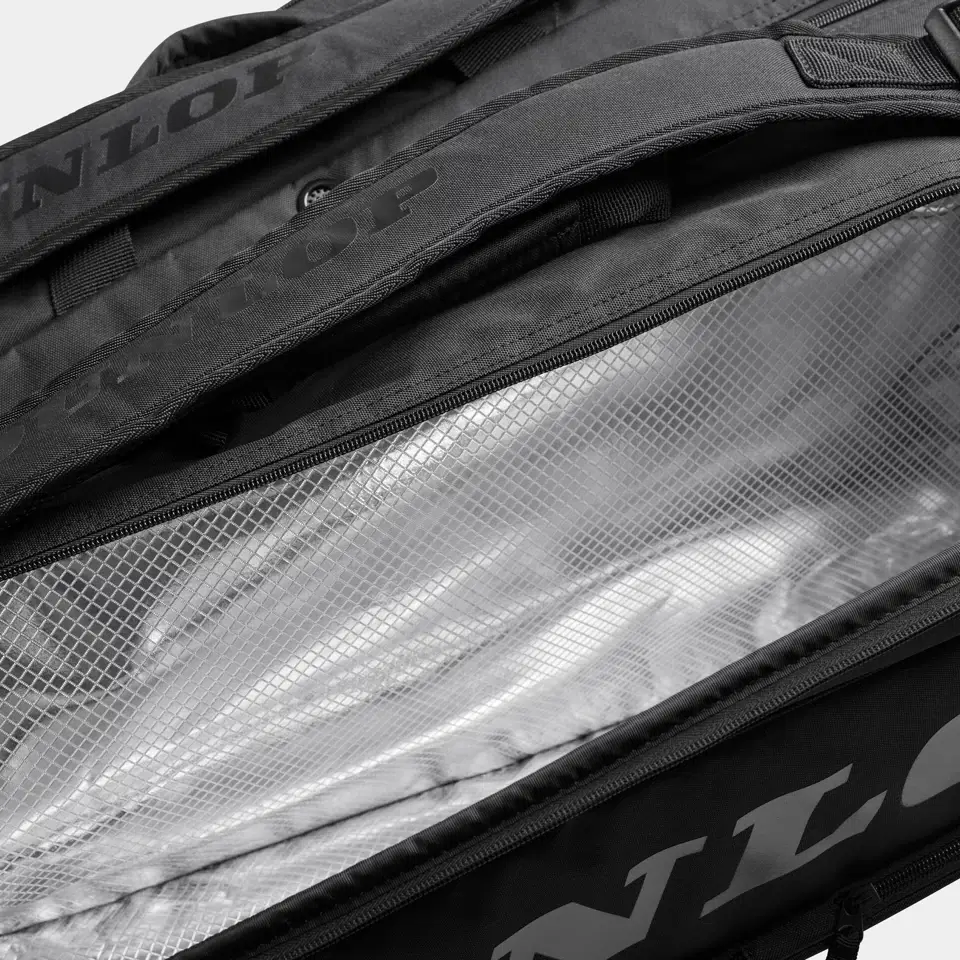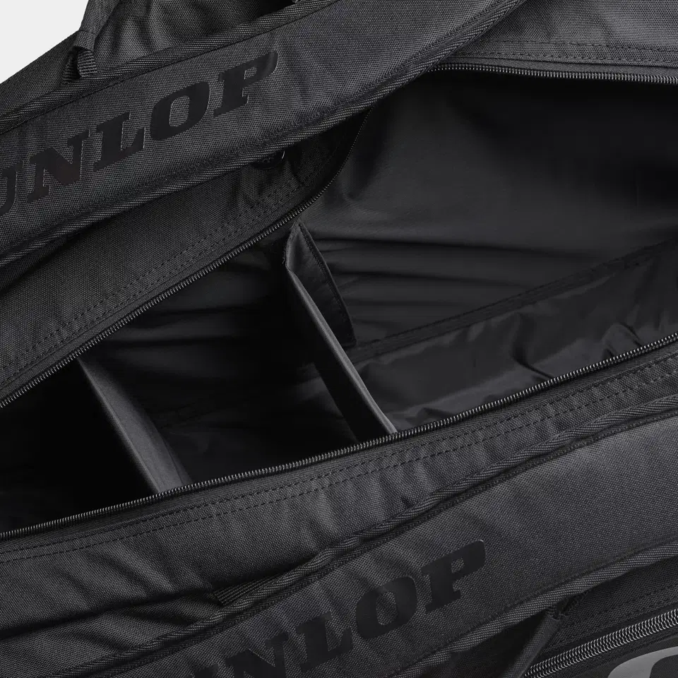 Dunlop Team 12 Schlägertasche. Die perfekte Schlägertasche für Squash, Tennis, Badminton oder Padel. Diese Tasche bietet Platz für fast alles und ist von höchster Qualität. Wenn Sie eine robuste und bequeme Badminton-, Squash- oder Tennistasche suchen, ist die Team-Version mit Thermo-Futter genau das Richtige für Sie. Es hält die Temperatur Ihrer Ausrüstung konstant und wirkt sich positiv auf die Bespannung aus. Mit ihrem eleganten, komplett schwarzen Design vereint diese Tasche hochwertige Materialien, Wärmeisolierung und ergonomischen Komfort und ist damit ein unverzichtbarer Begleiter für Training und Turniere.